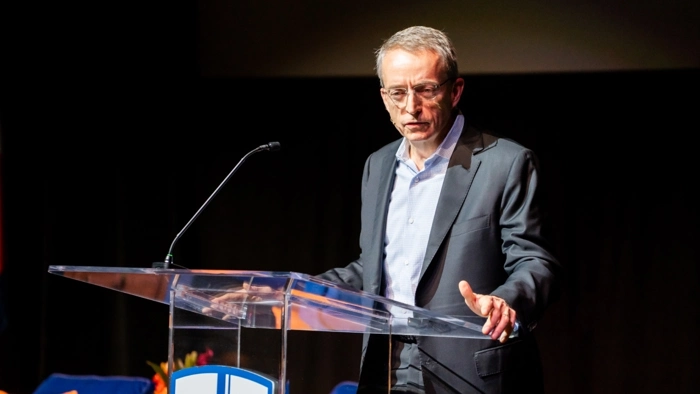 Pat Gelsinger, ex-CEO da Intel que agora atua como presidente executivo e chefe de tecnologia da Gloo, faz o discurso de abertura em "IA para a Humanidade: Navegando na Ética e Moralidade para um Futuro Florescente" na Colorado Christian University em Lakewood, Colorado, em 7 de outubro de 2025. | Cortesia da Colorado Christian University